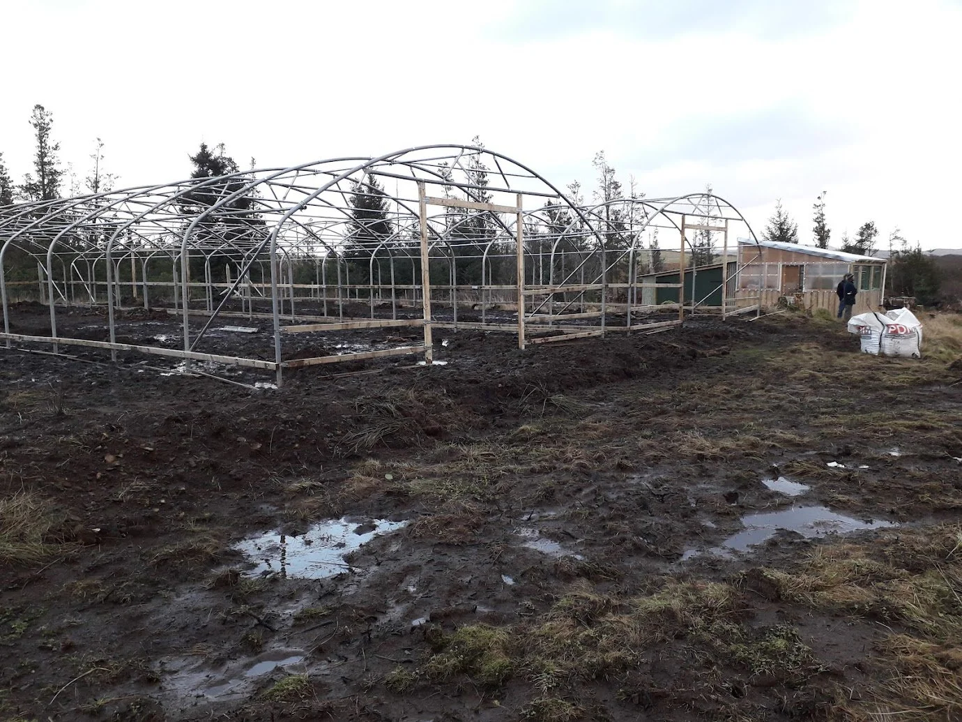 December 2025: Thanks to the Crofting Agricultural Grant the polytunnels are 80% funded! Ross from Kodiak Forestry came to remove the stumps on the old forestry site. Arran has put up the polytunnel frames with help of family members. Now we are waiting for a dry spell to put the skins on. When the weather turns warmer we will be able to tension the skins so they sit snuggly around the frames.
