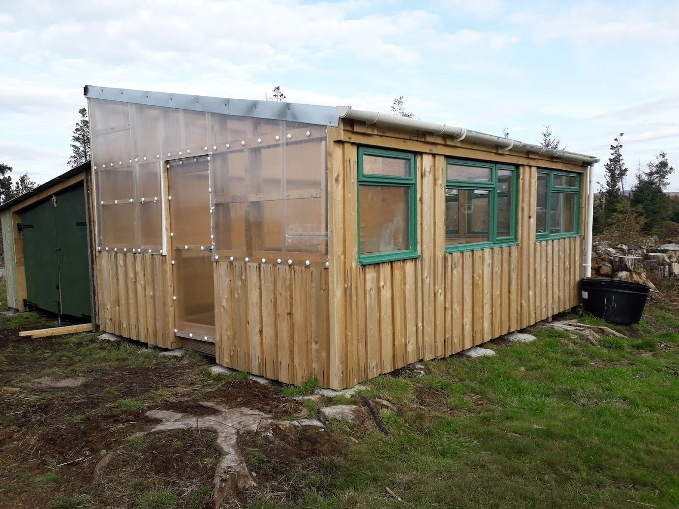 Summer 2025: The greenhouse/ potting shed is in place! We used second hand windows from a local restaurant, and polycarbonate sheeting as the roof. The second hand glass shelving came from the Hebridean Whale & Dolphin Trust. The greenhouse is equipped with a propagator to start off the seedlings.
